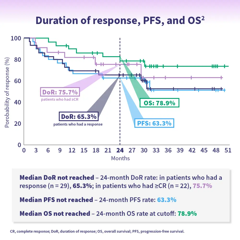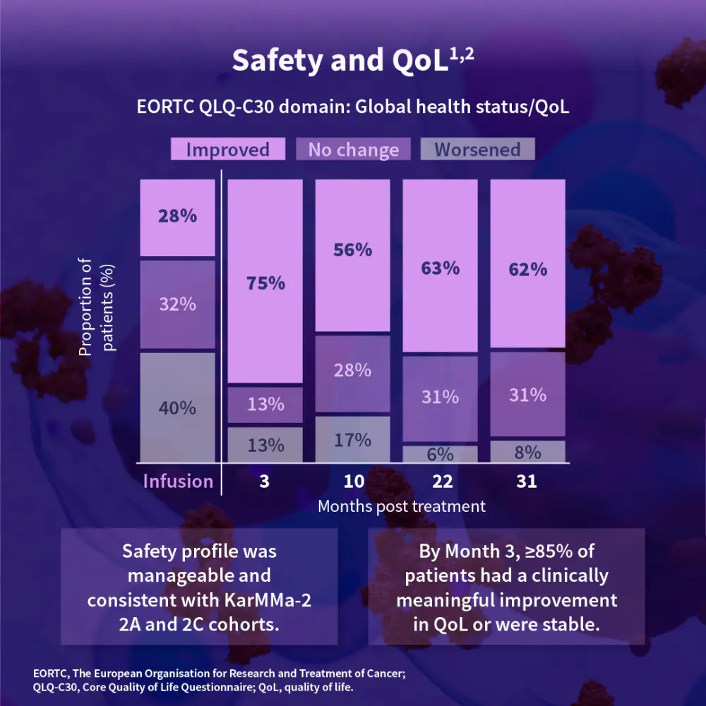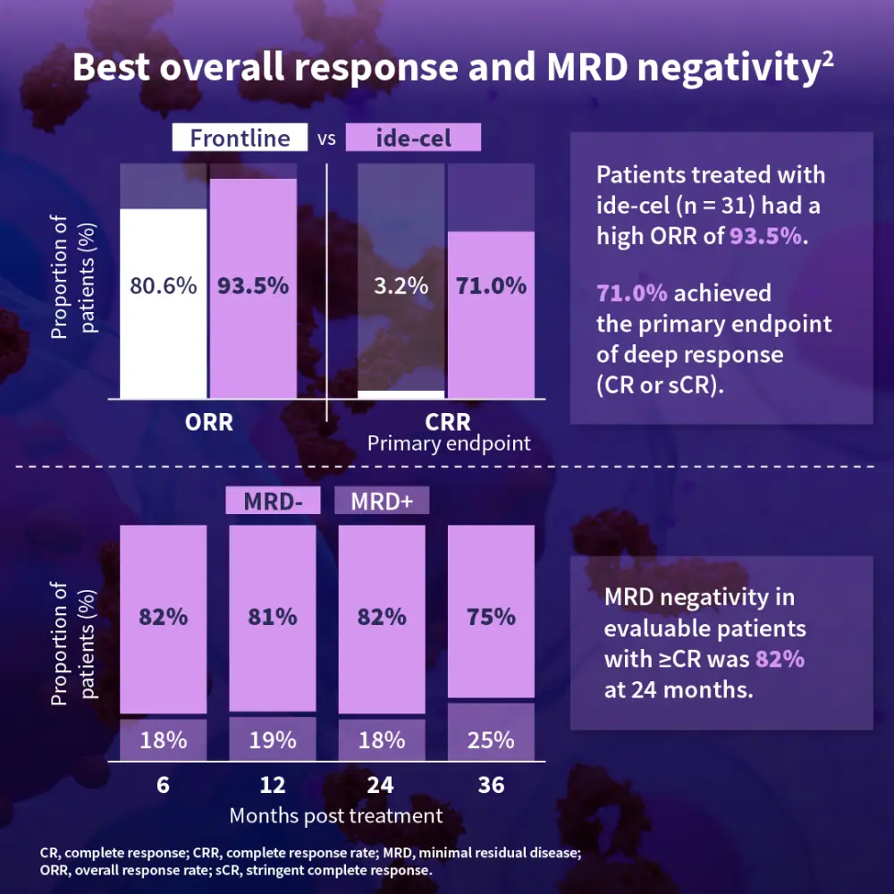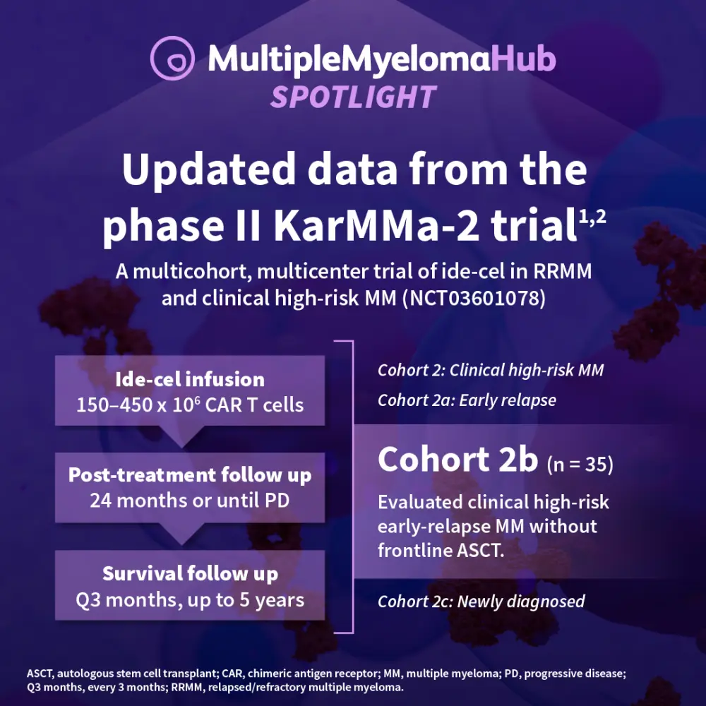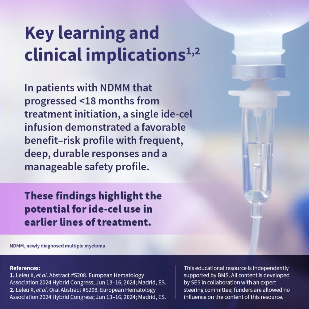 At the European Haematology Association Congress 2024, Xavier Leleu, Poitiers University Hospital, Poitiers, FR discussed results from Cohort 2B of the phase II KarMMa-2 trial (NCT03601078) investigating the safety and efficacy of idecabtagene vicleucel (ide-cel) in patients with clinical high-risk early-relapse multiple myeloma without frontline stem cell transplantation (N = 31). The primary endpoint of complete response rate was achieved in 71% patients, highlighting the potential for ide-cel use in earlier lines of treatment.