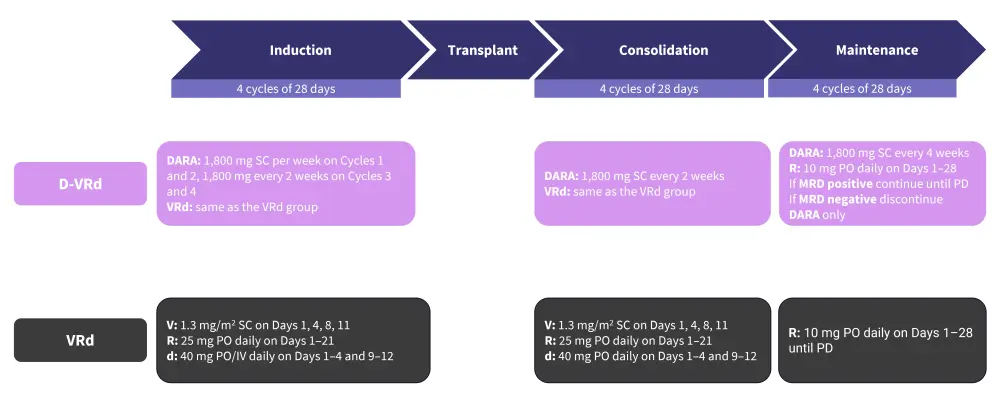 d, dexamethasone; DARA, daratumumab; D-VRd, daratumumab + bortezomib + lenalidomide + dexamethasone; MRD, measurable residual disease; PD, progressive disease; PO, oral; R, lenalidomide; SC, subcutaneous; V, bortezomib; VRd, bortezomib + lenalidomide + dexamethasone.