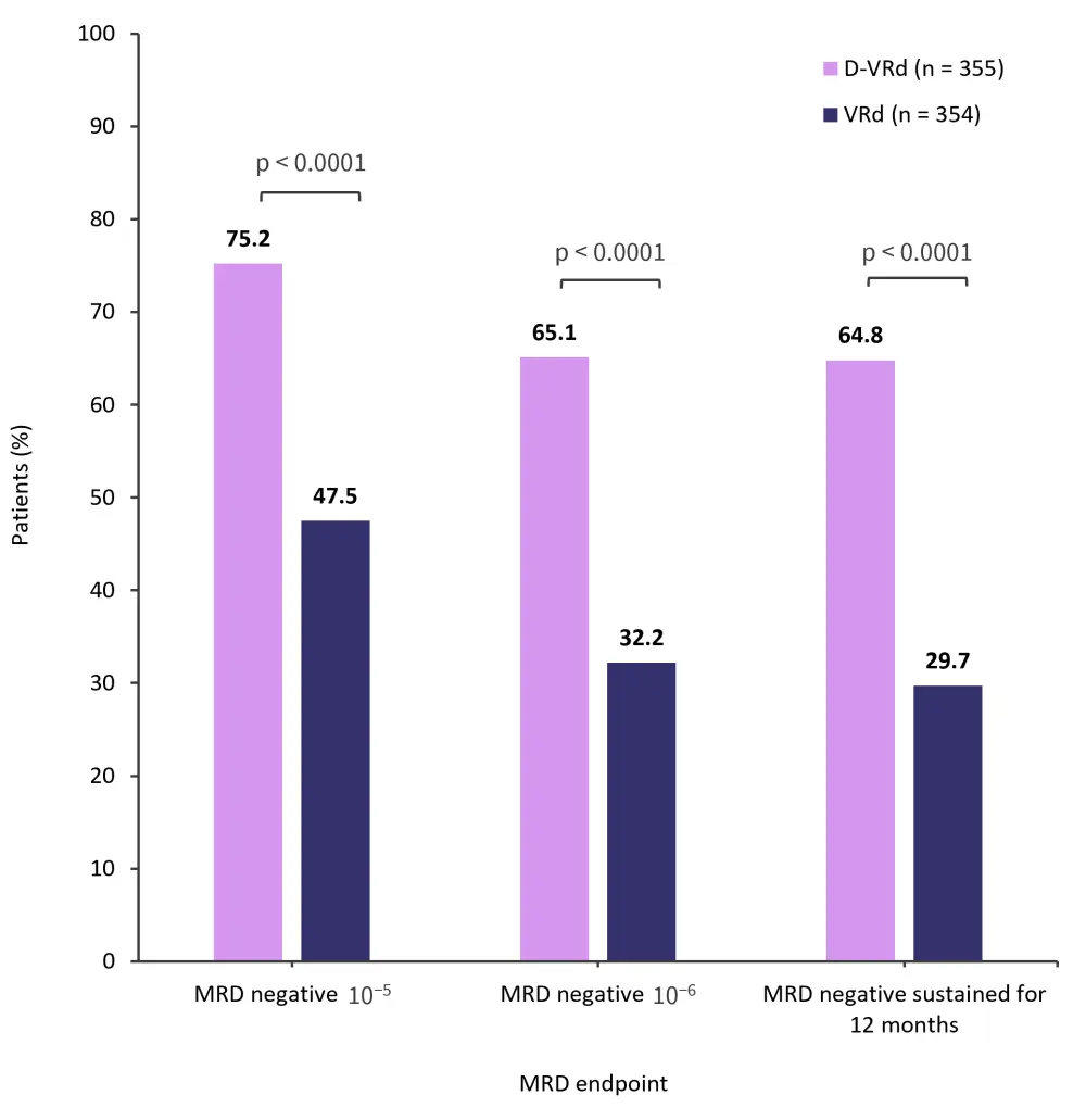 D-VRd, daratumumab + bortezomib + lenalidomide + dexamethasone; MRD, measurable residual disease; VRd, bortezomib + lenalidomide + dexamethasone.