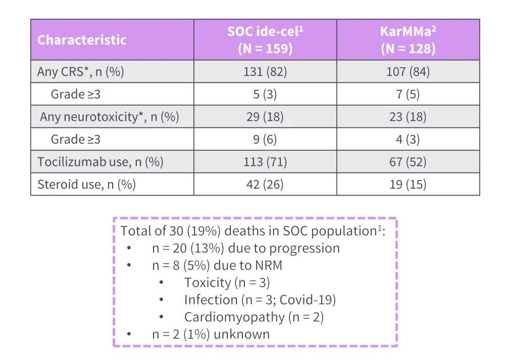 CRS, cytokine release syndrome; ide-cel, idecabtagene vicleucel; NRM, non-relapse mortality; NT, neurotoxicity; SOC, standard of care.