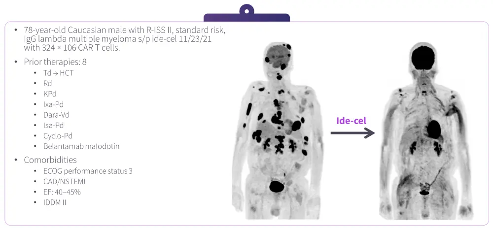 Here, Hansen discusses a case study of a 78-year-old caucasian male with multiple comorbidities and prior exposure to a BCMA-directed agent (Figure 1), they were treated with idecabtagene vicleucel (ide-cel). Hansen uses the case study to examine real-world safety and efficacy data for both ide-cel (Figure 2) and ciltacabtagene autoleucel (cilta-cel), making comparisons with clinical trial data from KarMMa and CARTITUDE-1.1