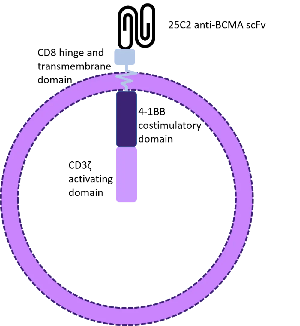 CT053 is an investigational, second-generation chimeric antigen receptor (CAR) T-cell product with a human B-cell maturation antigen (BCMA)-specific single-chain fragment variant (25C2) and high binding affinity; see Figure 1. The U.S. Food and Drug Administration (FDA) granted CT053 regenerative medicine advanced therapy designation in 2019. The advantage of this CAR T-cell therapy is that the manufacturing time is shorter than the average CAR T-cell production, at only 8−10 days between apheresis and infusion.1 For patients with relapsed/refractory multiple myeloma (RRMM), a reduced wait time before CAR-T infusion can have a significant impact on survival outcome.