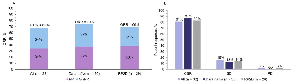 A ORRs and B survival outcomes to SDd in all enrolled patients, patients who are dara naïve, and patients who received the RP2D.