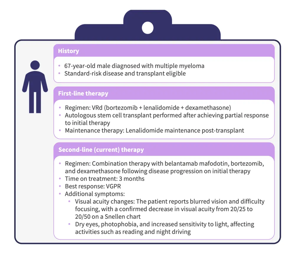 In this panel discussion, the speakers addressed key considerations in managing treatment-related toxicities, particularly with advanced and targeted therapies in MM. The conversation focused on the use of belantamab mafodotin in both relapsed and first-line settings, emphasizing the importance of optimizing quality of life and managing side effects, without sacrificing outcomes. The speakers explored belantamab mafodotin-based combinations, highlighting dosing strategies to minimize ocular toxicities (Figure 1).
