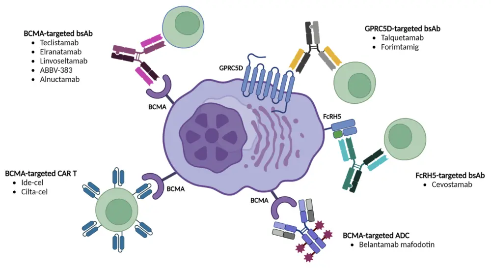 ADC, antibody–drug conjugate; BCMA, B-cell maturation antigen; bsAb, bispecific antibody; cilta-cel, ciltacabtagene autoleucel; FcRH5, Fc receptor homolog 5; GPRC5D, G protein-coupled receptor class C group 5 member D; ide-cel, idecabtagene vicleucel.
