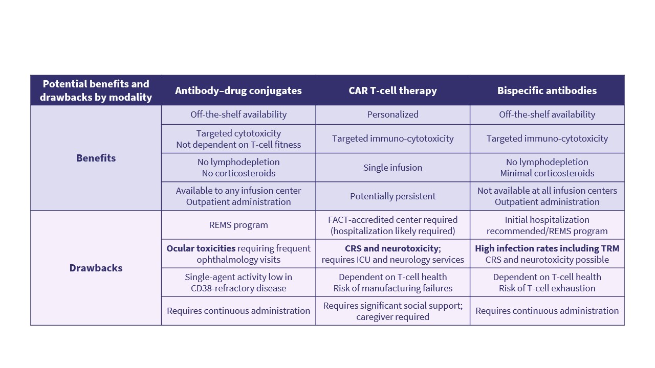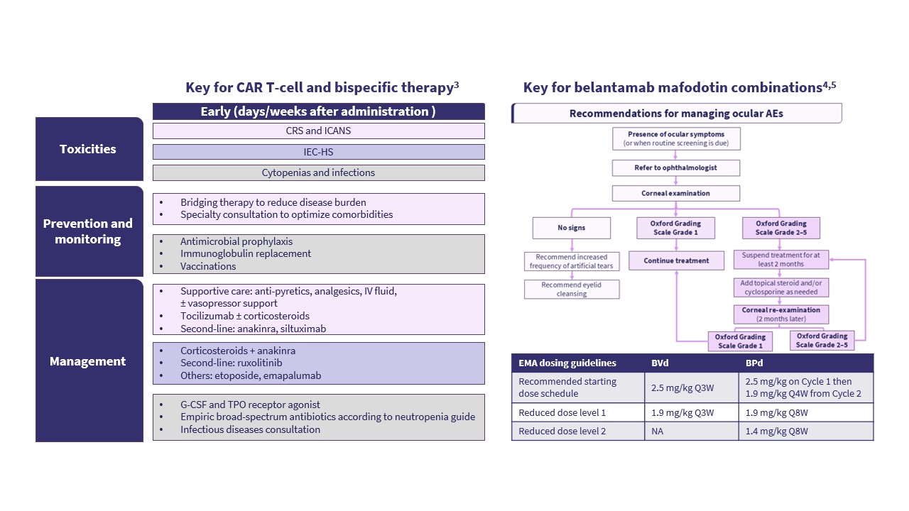 CAR T-cell therapies and BsAbs provide targeted immuno-cytotoxicity but are associated with immune-mediated toxicities and infections, as well as higher care complexity.1,2
