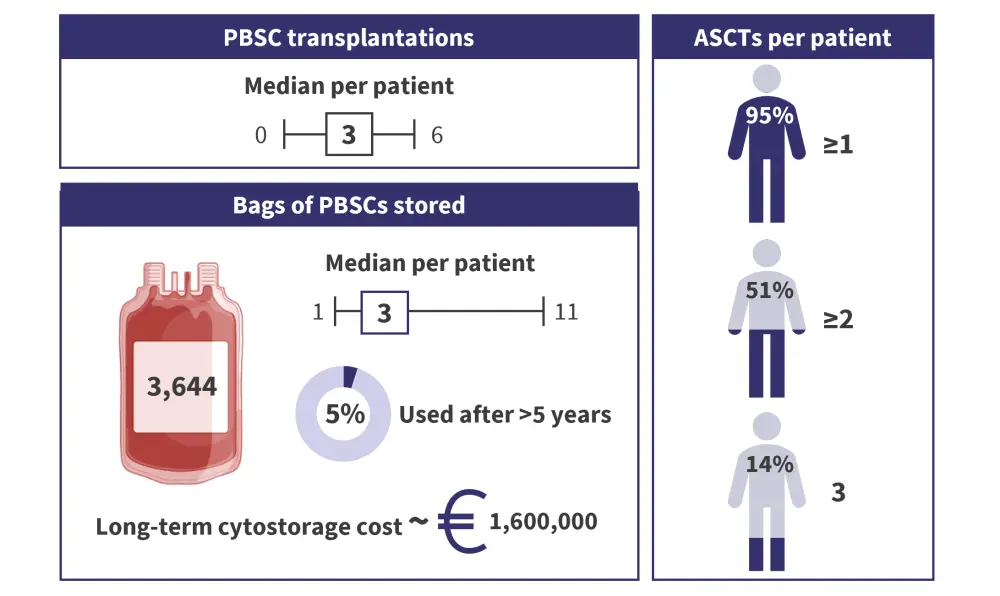ASCT represents an effective therapy for patients with MM, with most patients receiving up to 2 or 3 transplants. The amount of PBSCs generated can vary significantly, affecting treatment decisions and storage considerations. Only a small percentage of cryopreserved PBSCs are utilized, increasing storage costs and raising ethical and practical concerns over further storage or disposal.