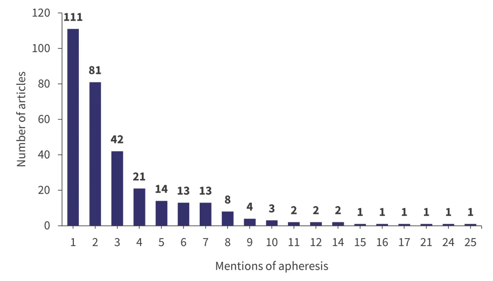 Of the 670 studies identified, 621 studies were included, with a total of 1,044 mentions of apheresis in 322 studies. Apheresis was mentioned zero times in 299 articles (48%.1), with decreasing numbers of articles featuring increasing mentions of apheresis; only 7 (1.1%) and 5 (0.7%) articles mentioned apheresis 11–15 and 16–20 times, respectively (Figure 1).