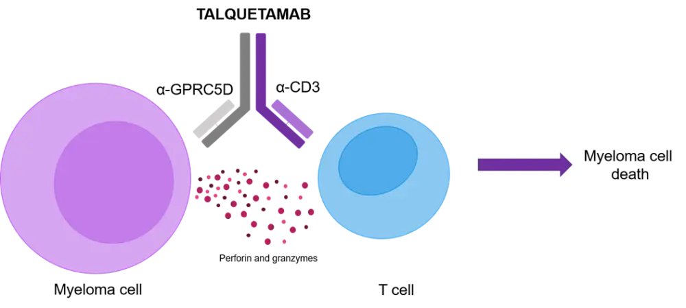 All things considered, GPRC5D has been proposed as a suitable target for CD3-mediated T-cell redirection, resulting in the design of an anti-GPRC5D × CD3 bispecific antibody. The first-in-class bispecific antibody, talquetamab (Figure 1), facilitates the interaction of T-cells and GPRC5D-expressing myeloma cells and subsequent MM cell death. Preclinical and xenograft studies have uncovered the promising anti-tumor activity of talquetamab. An additional asset of talquetamab is its pharmacokinetic (PK) profile, which may reduce the frequency of subcutaneous dosing and, therefore, positively impact the patient experience.1