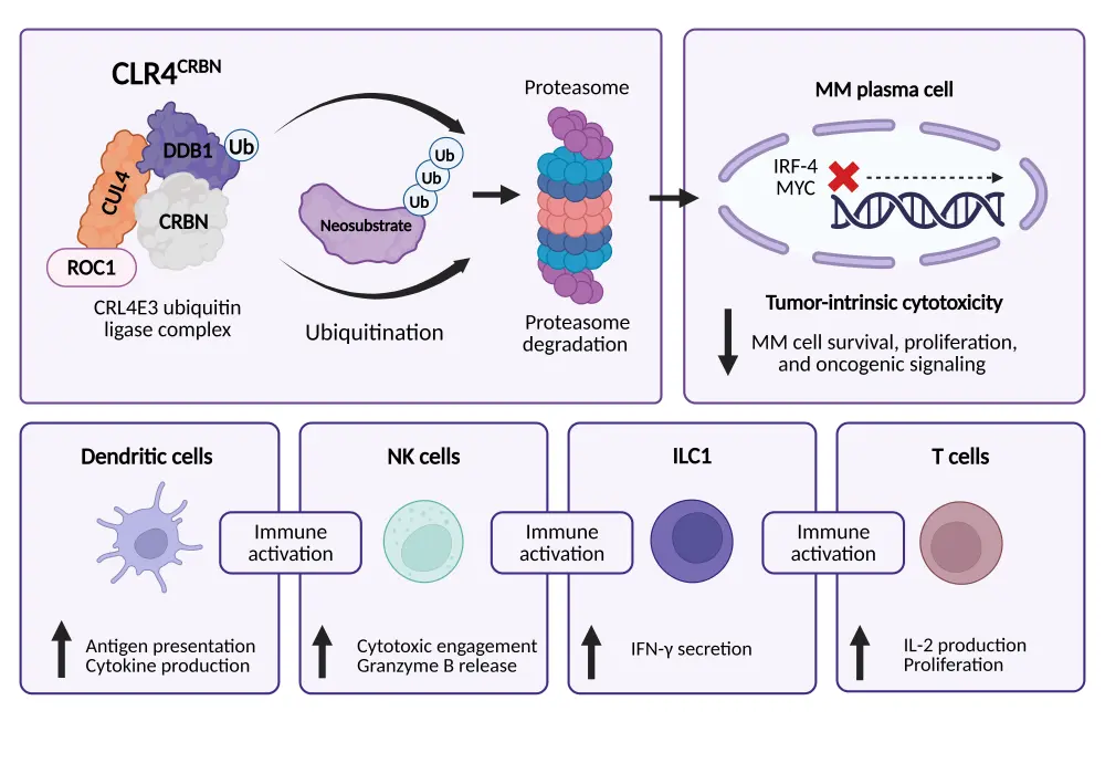 Cereblon is the substrate receptor within the CUL4–RBX1–DDB1 E3 ubiquitin ligase complex and the central molecular target of both IMiDs and CELMoDs in MM (Figure 1).1 IKZF1 and IKZF3 are highly expressed and functionally required in MM cells, and next-generation CELMoDs, including iberdomide and mezigdomide, are structurally optimized cereblon-binding agents that induce deeper and more sustained degradation of IKZF1 and IKZF3 than traditional IMiDs.1 While IMiDs bind cereblon and induce degradation of IKZF1 and IKZF3, next-generation CELMoDs are designed to enhance cereblon engagement and stabilize interactions between cereblon and its substrates, thereby increasing the efficiency of the CUL4–RBX1–DDB1 E3 ubiquitin ligase complex and enabling deeper, more sustained target protein degradation. Enhanced degradation of IKZF proteins leads to downstream reductions in IRF4 and MYC expression, transcriptional drivers of myeloma cell survival and proliferation.1 Enhanced IKZF degradation also augments immune effector function, promoting T-cell activation, cytokine production, and natural killer cell-mediated cytotoxicity.1