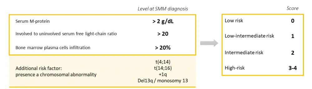 As a result of the established new criteria for MM, there was a need to redefine SMM risk classification. For that purpose, María-Victoria Mateos and colleagues undertook a large, retrospective cohort study to identify factors predicting patients at high risk of progression to MM at 2 years. Here, we present their work published recently in the Blood Cancer Journal and the resulting risk score to guide treatment decisions for patients with SMM.1