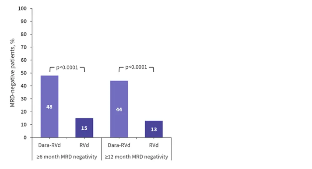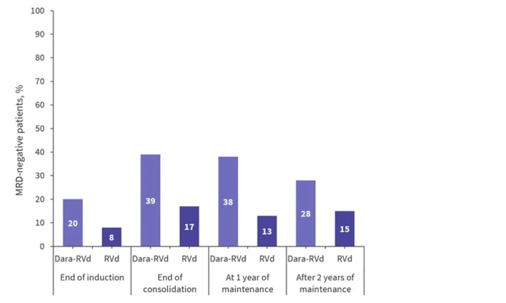 Dara-RVd used as an induction regimen produced a higher level of CR than RVd in patients with NDMM. MRD negativity rates were also seen to be greater in the dara-RVd arm than the RVd arm and these deepened over time. There was a positive trend towards increased PFS in the dara-RVd arm compared with the RVd arm, although the study was not powered to assess PFS. No new safety signals were observed following 2 years of maintenance with dara-R or R, and due to the continuous response improvement observed, patients were encouraged to stay on R maintenance therapy beyond the completion of the study treatment.