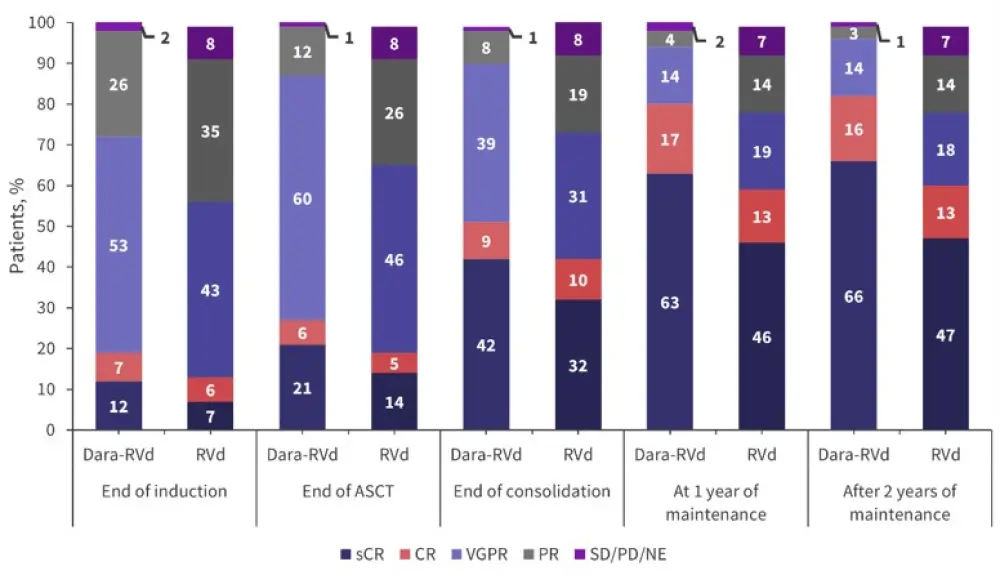 ASCT, autologous stem cell transplant; CR, complete response; dara-RVd, daratumumab, lenalidomide, bortezomib, and dexamethasone; NE, not evaluable; PD, disease progression; RVd, lenalidomide, bortezomib, and dexamethasone; sCR, stringent CR; SD, stable disease; VGPR, very good partial response.