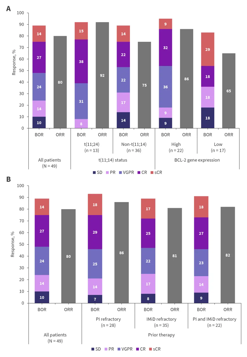 BCL2, B-cell lymphoma 2; BOR, best overall response; CR, complete response; IMiD, immunomodulatory drug; ORR, overall response rate; PI, proteasome inhibitor; PR, partial response; sCR, stringent CR; SD, stable disease; VGPR, very good partial response.