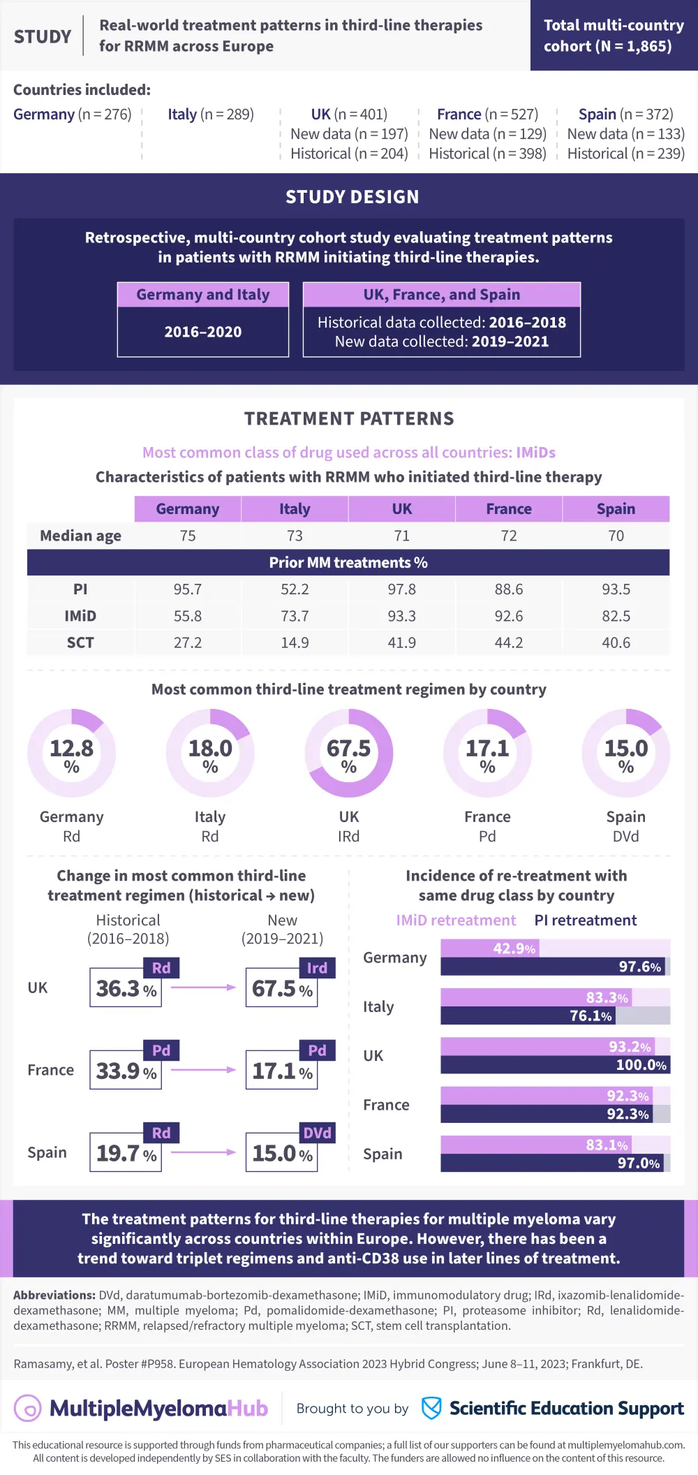 The Multiple Myeloma Hub is pleased to present a visual abstract representing data from a retrospective multi-country study evaluating treatment patterns in patients with relapsed/ refractory multiple myeloma (RRMM) initiating third-line therapies. Data were collected from patients in Germany, France, Italy, Spain, and the United Kingdom (UK).