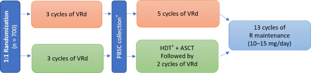 ASCT, autologous stem cell transplantation; MRD, minimal residual disease; NR, not reached; OS, overall survival; PFS, progression-free survival; PFS2, PFS on second-line therapy; VRd, bortezomib, lenalidomide, and dexamethasone. |