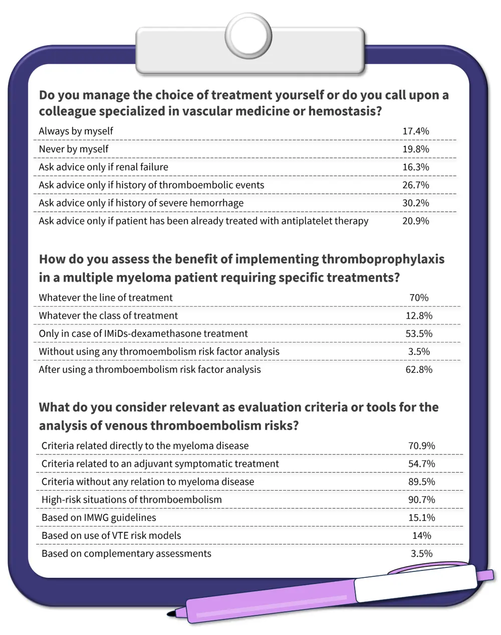 To more investigate the causative contributions of these factors, the Intergroupe Francophone du Myélome (IFM) conducted a large survey for clinicians regarding their current thromboprophylaxis practices, and used this to develop guideline recommendations for thromboprophylaxis of patients with MM.