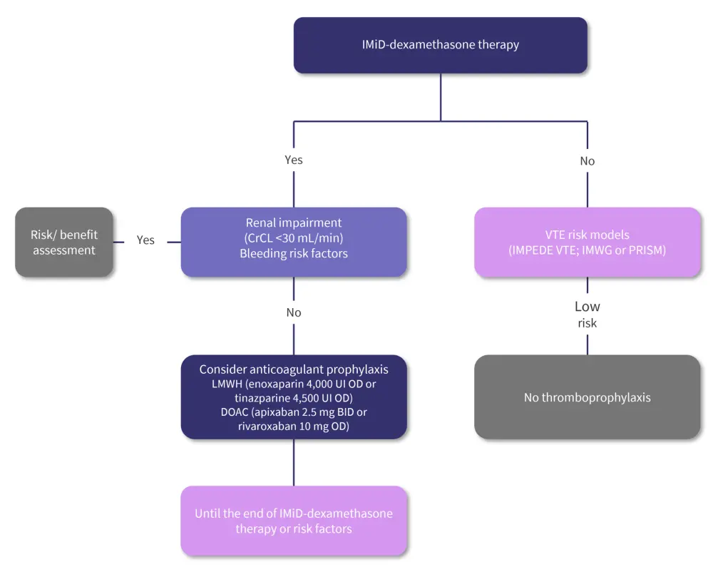 The choice of an IMiD-dexamethasone-based therapy emerged as the key factor to initiating the decision algorithm, based on published data showing that the risk of VTE is up to 25% higher in those being treated with IMiDs, particularly in combination with dexamethasone. Alongside existing therapy, there are several highlighted risk factors including renal impairment and bleeding risks, which are also associated with a higher likelihood of VTEs.